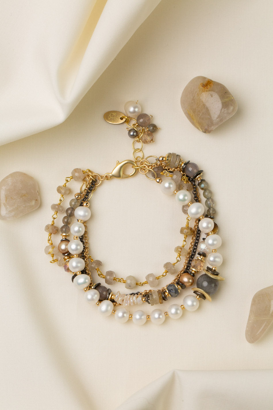 Alchemy 7.75-8.75" Freshwater Pearl, Gold Rutilated Quartz, Abalone Multistrand Bracelet