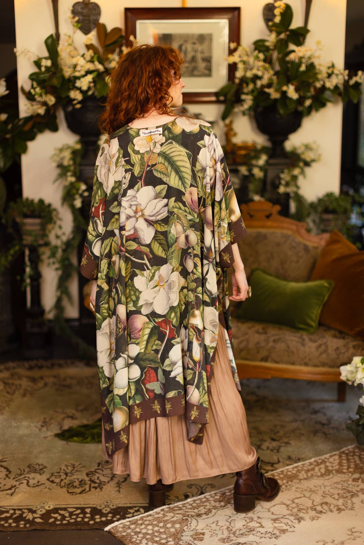 Fleur de Lune is our luminous tribute to moonlit gardens and creative dreams. This design features 18th–19th century magnolia lithographs, hand-colored fruit engravings, and delicate moths — including the ethereal luna moth — from vintage etchings. Golden bees on the trim come from a Victorian book cover. The background is deeply personal to Danielle, the creative behind Market of Stars. It’s a photo of her 150-year-old work table. Fleur de Lune is an homage to the gardens that glow beneath the stars while we dream, where new ideas drift like the scent of magnolias in the night air, and the imagination — like a moth — is forever drawn to the light of the moon. 100% viscose (derived from plant fibres such as wood and bamboo). Machine wash gentle or handwash and hang to dry. Kimono measurements: length 92cm , width 110cm. boho bohemian gypsy vintage antique garden nature spring elegant botanical