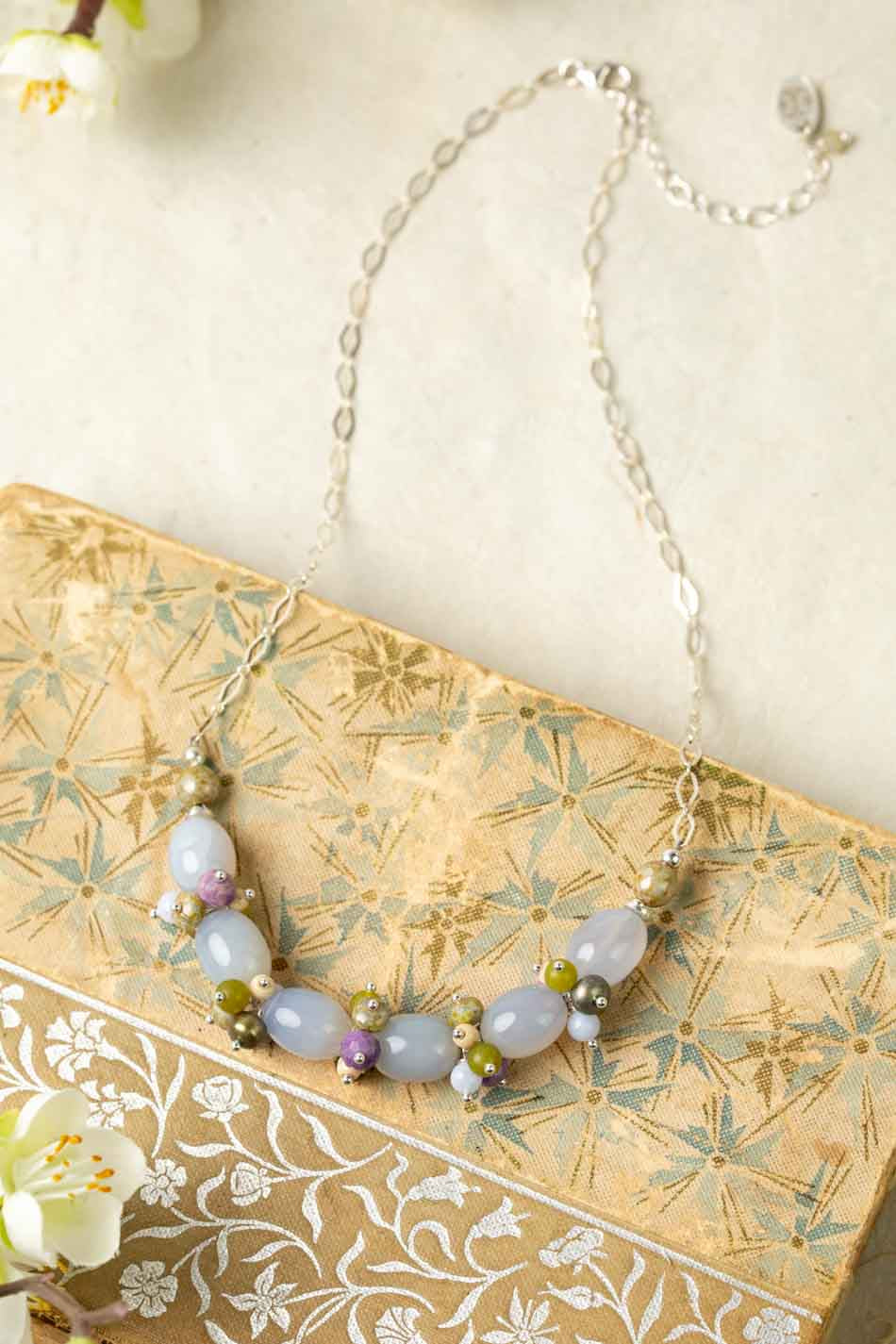Cave Spring 15.25-17.25" Phosphosiderite, Olive Jade, Freshwater Pearl With Blue Lace Chalcedony Cluster Necklace