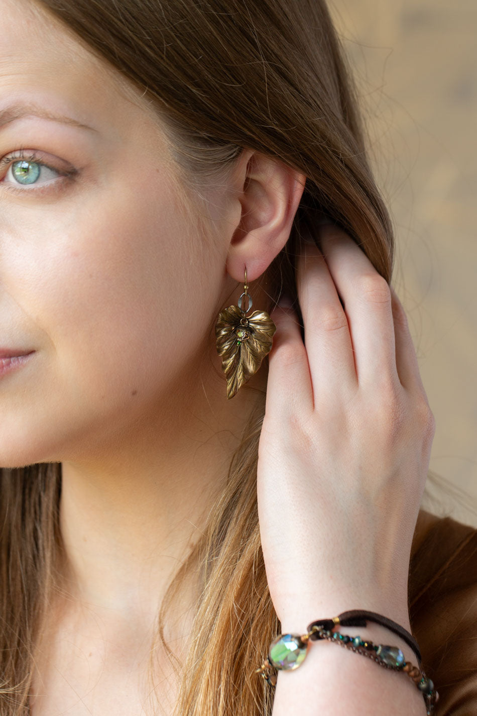 Crisp Autumn Antique Brass Leaf, Crystal Statement Earrings