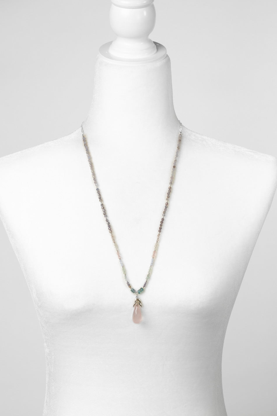 Fae 25.5-27.5" Aquamarine, Iolite, Blue Apatite With Rose Quartz Drop Briolette Statement Necklace