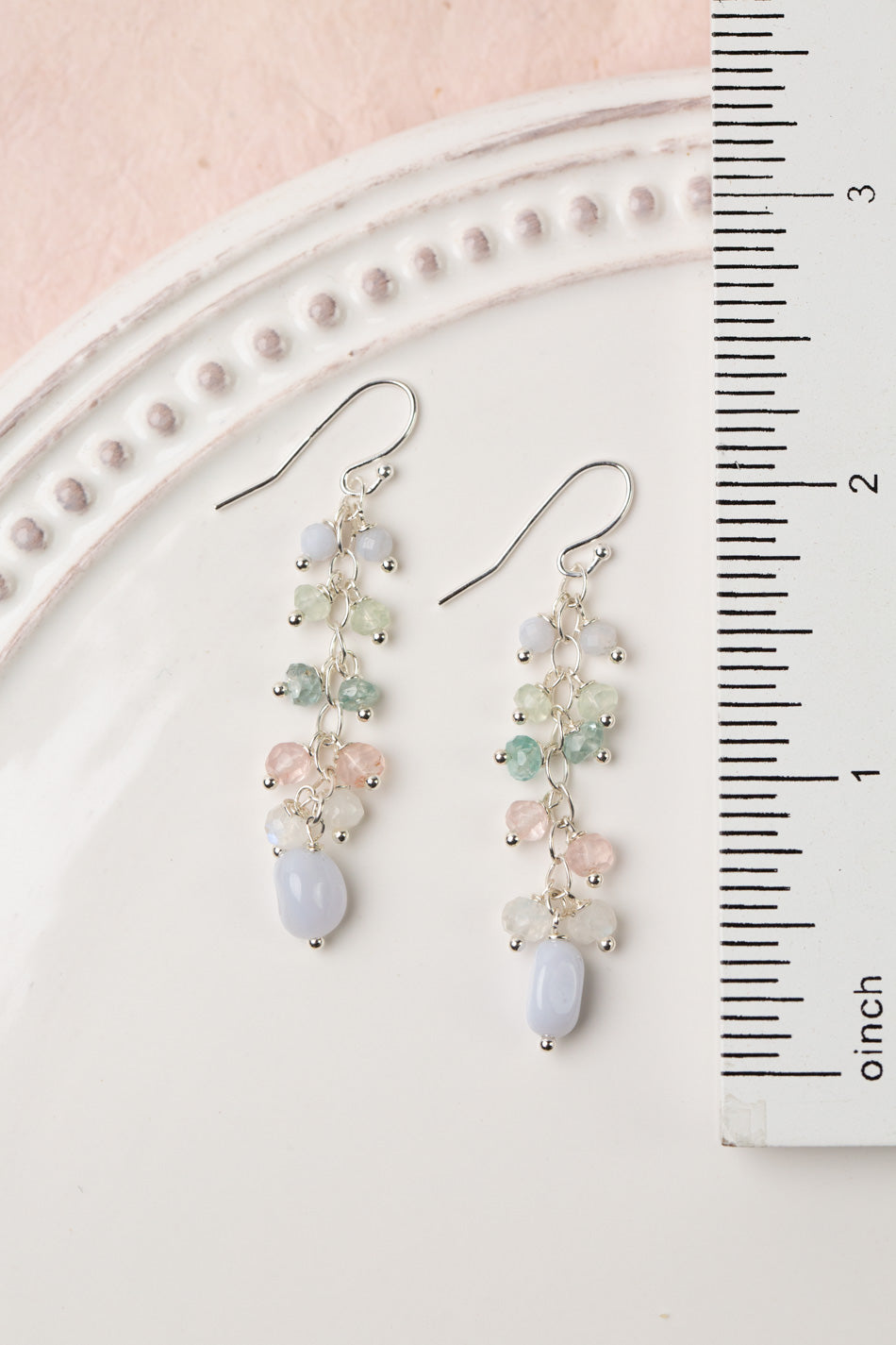 Fae Rose Quartz, Blue Apatite, Prehnite With Blue Lace Chalcedony Cluster Earrings