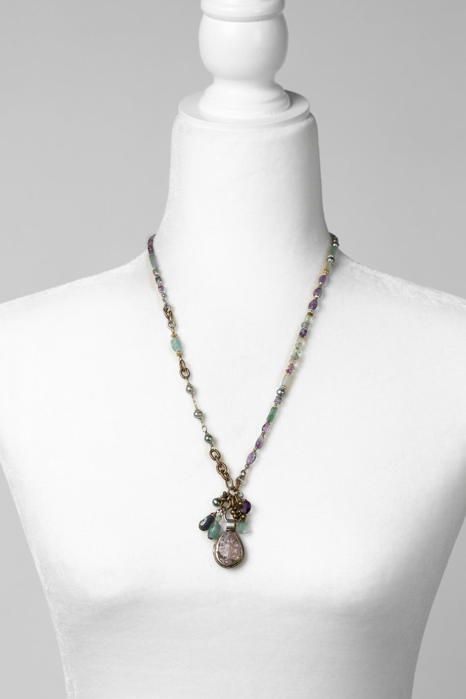 Aspire 23.5-25.5" Fluorite, Roman Glass, Freshwater Pearl With Tibetan Amethyst Pendant Statement Necklace
