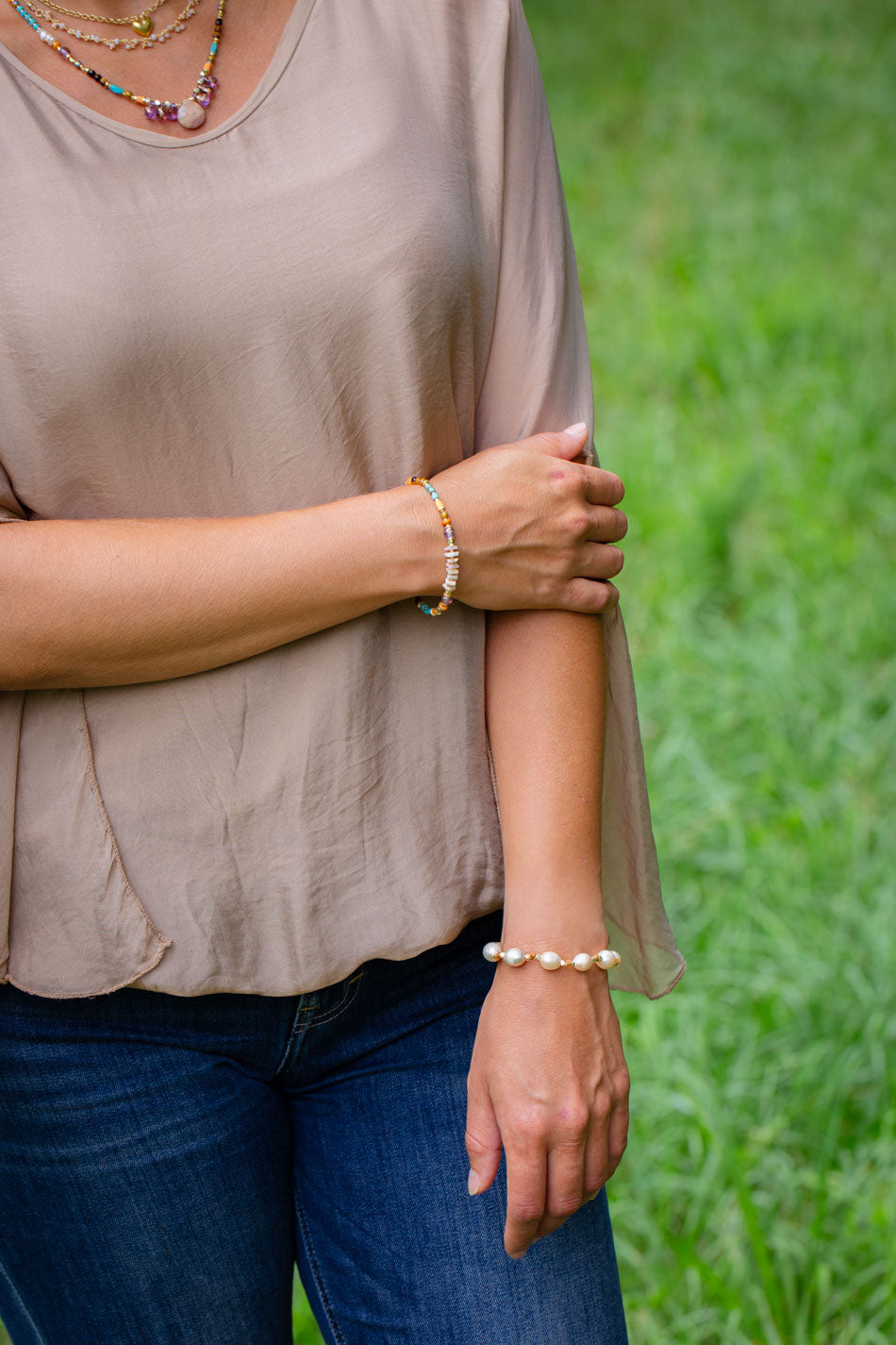 Contentment 7.5-8.5" Green Amethyst, Pearl, Rainbow Moonstone Multistrand Bracelet