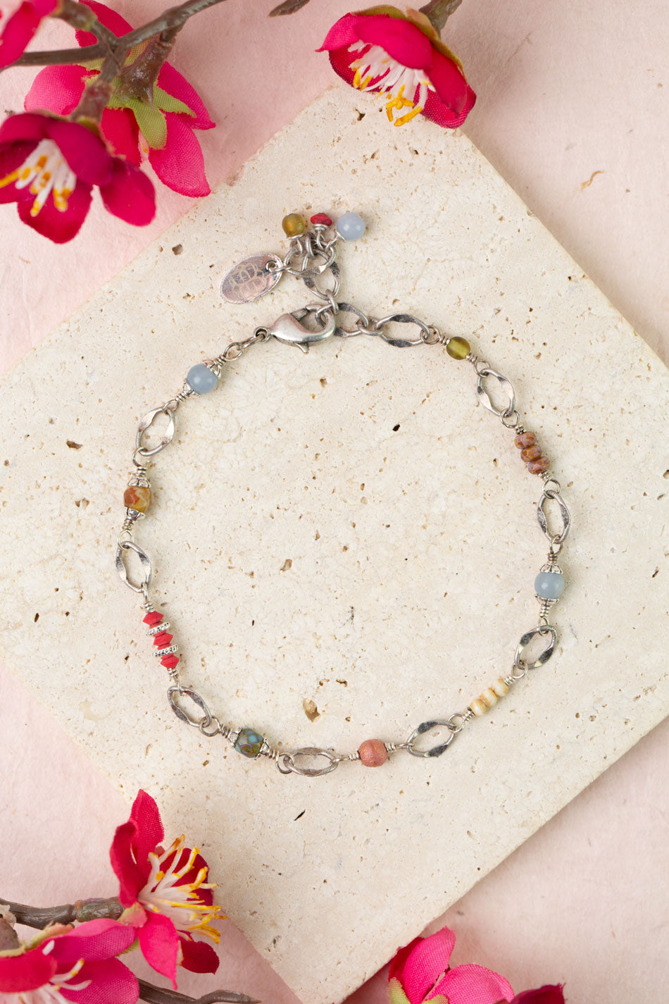 Leilani brings a touch of paradise to any look. Soft pastels mingle with vibrant pops of coral, turquoise, and sea-glass hues, layered with delicate silver details and playful charms.