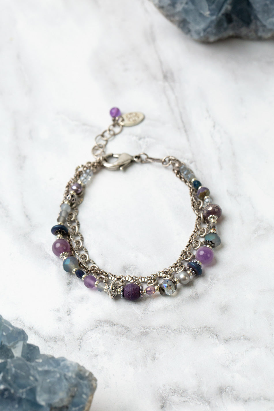 Experience the beauty and versatility of the Reflections Collection. Each piece is thoughtfully handcrafted using carefully chosen materials. This multistrand bracelet measures 7.5-8.5" and is completed an antique silver plated brass extender chain and lobster claw clasp. Elevate your style with Reflections.