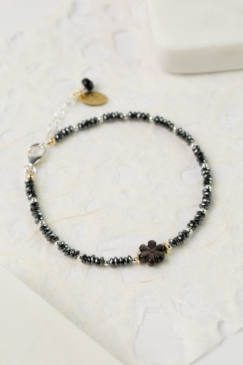 Nightfall 7.5-8.5" Black Hematite Rondelle, Abalone Flower Simple Bracelet