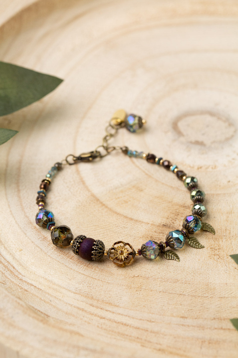 Crisp Autumn 7.5-8.5" Faceted Crystal, Czech Glass Flower, Antique Brass Leaves Collage Bracelet