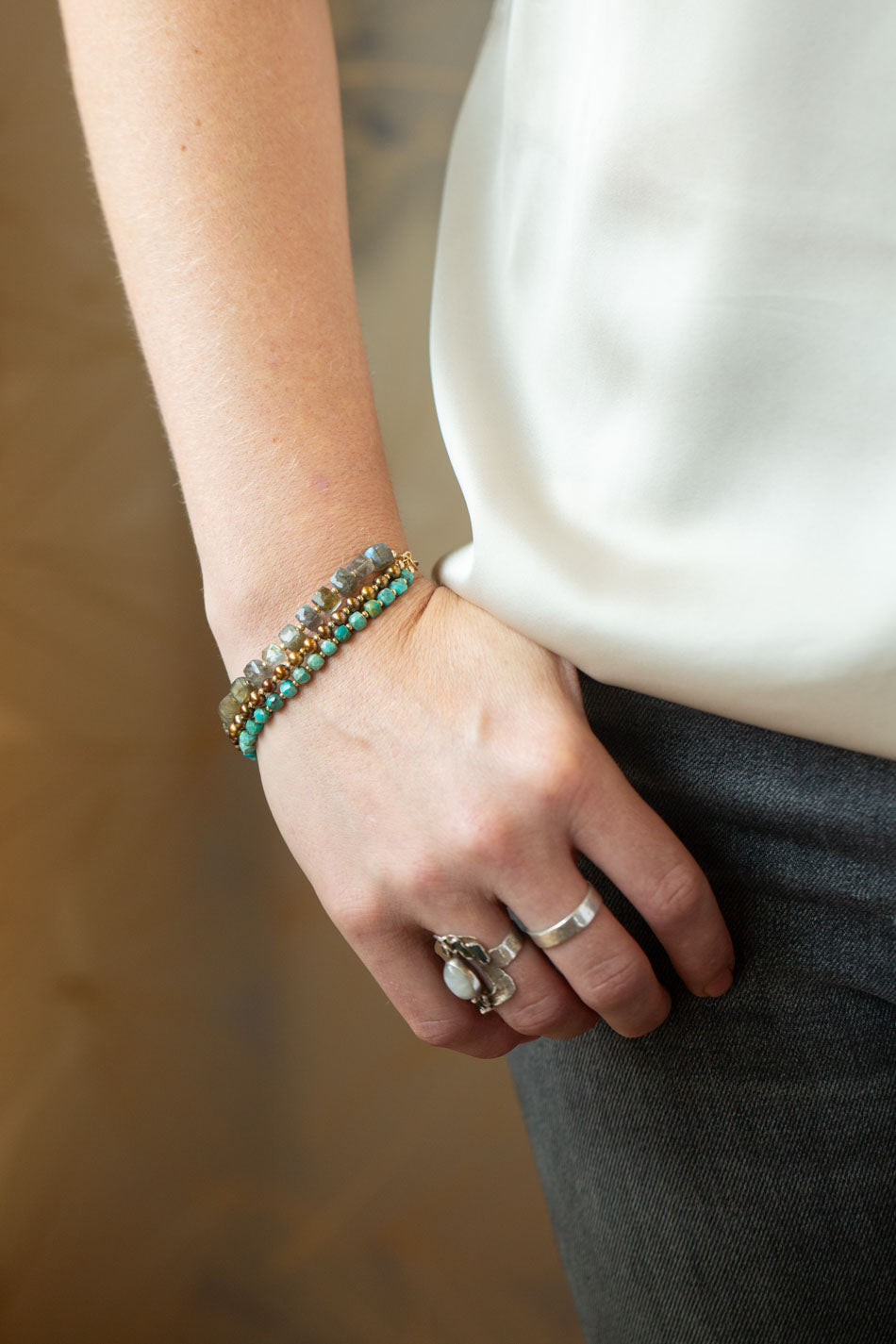 Desert Sunset 7.5-8.5" Labradorite, Turquoise, Freshwater Pearl Multistrand Bracelet