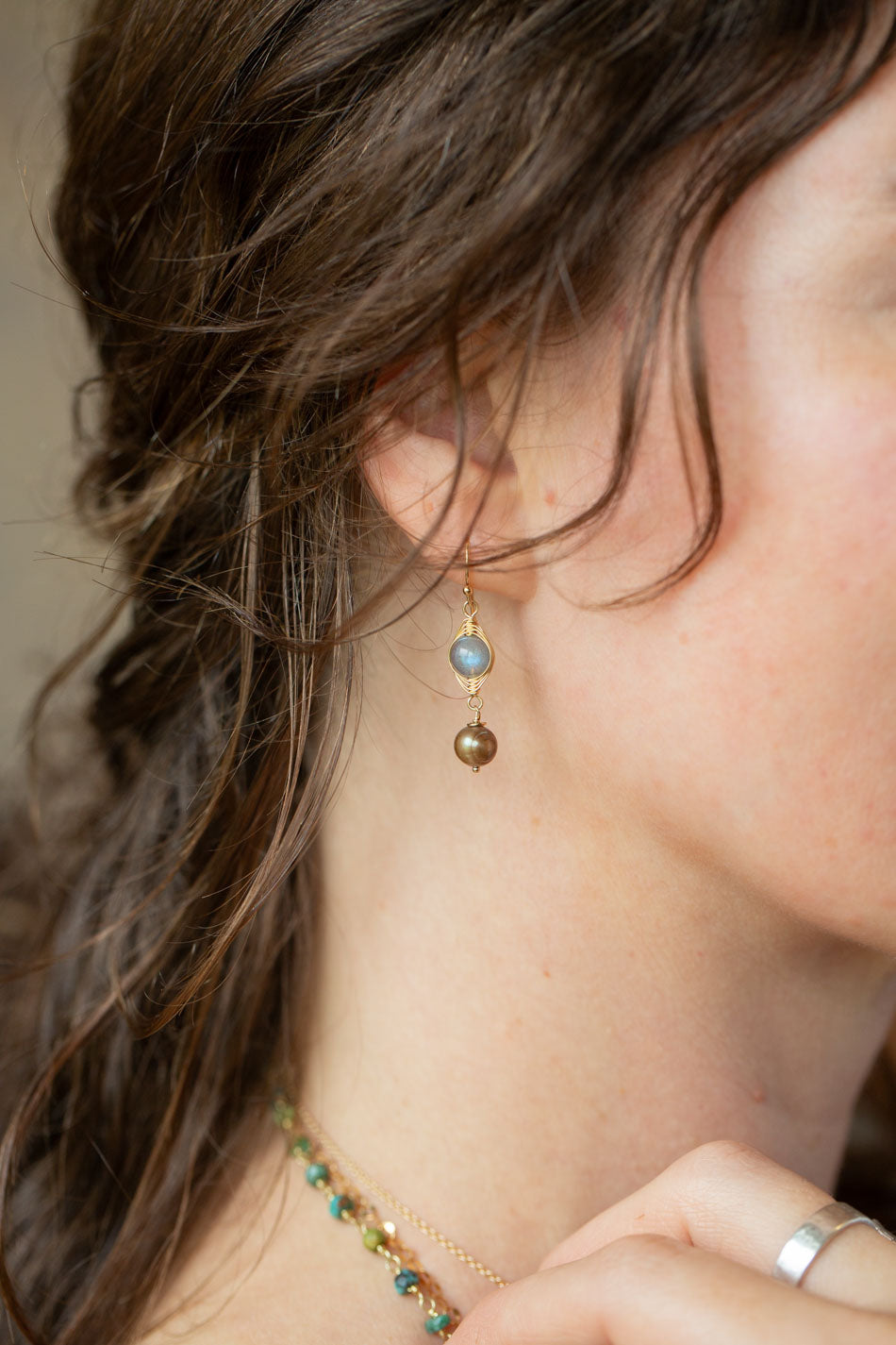 Desert Sunset Freshwater Pearl, Labradorite Herringbone Earrings
