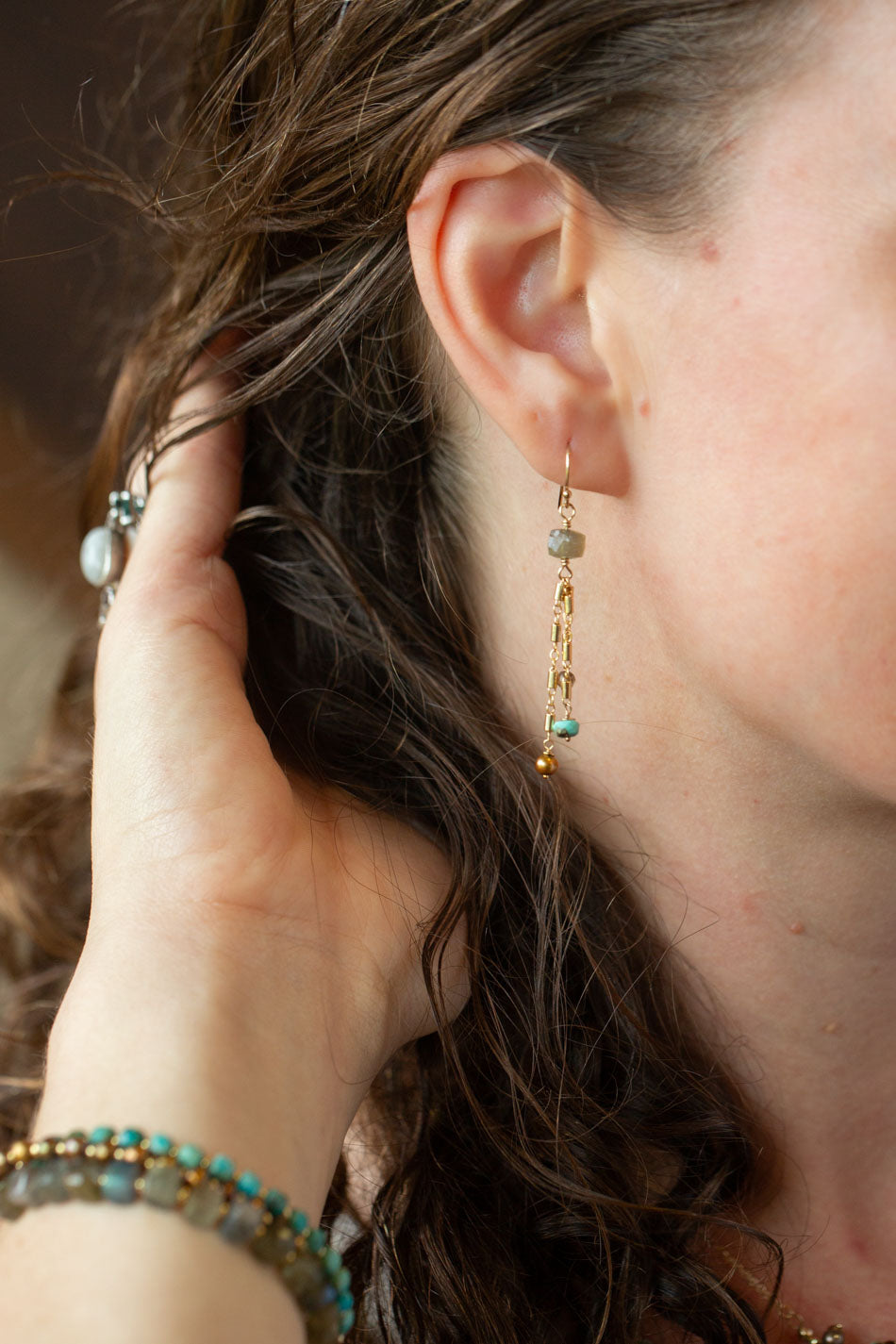 Desert Sunset Turquoise, Freshwater Pearl, Smokey Quartz With Labradorite Dangle Earrings