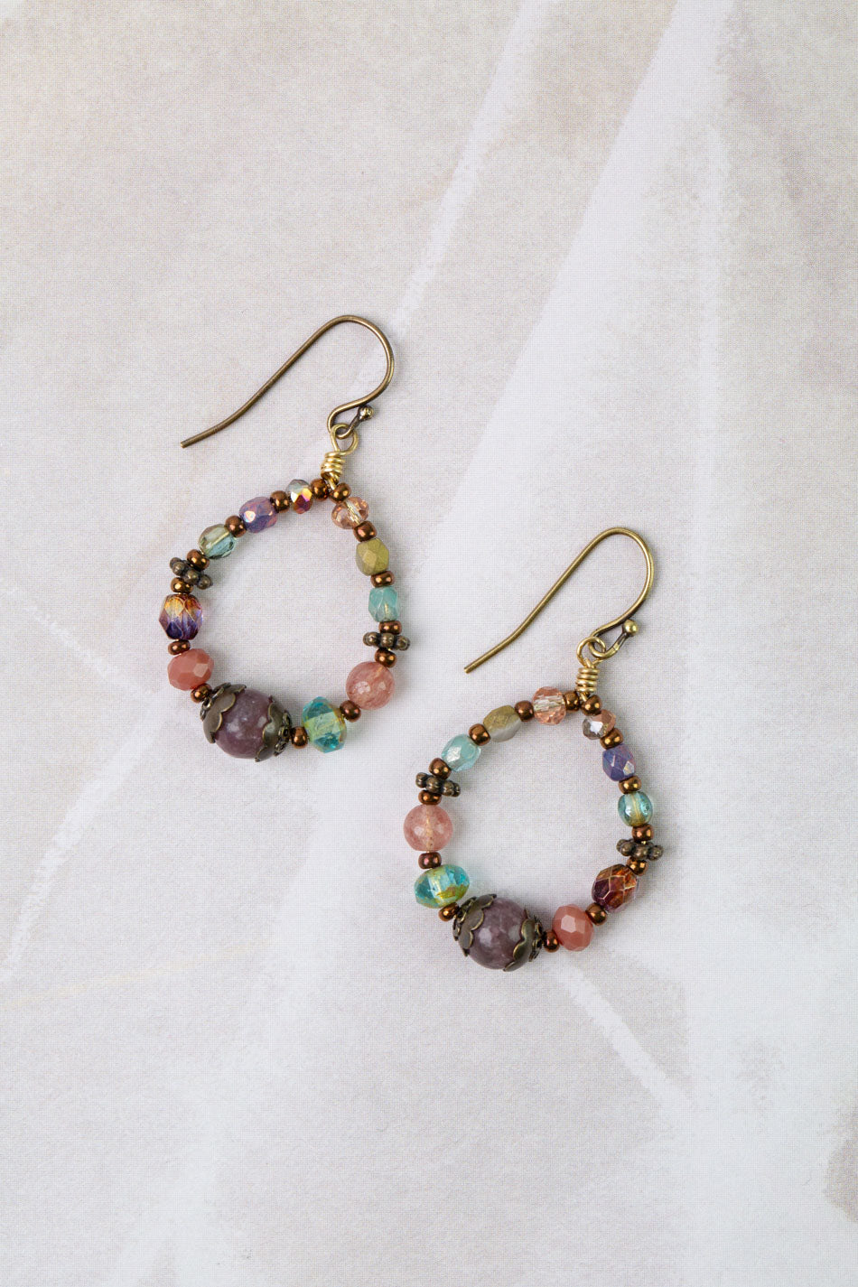 Aspire Antique Brass Hoops With Rainbow Fluorite, And Amethyst Hoop Earrings