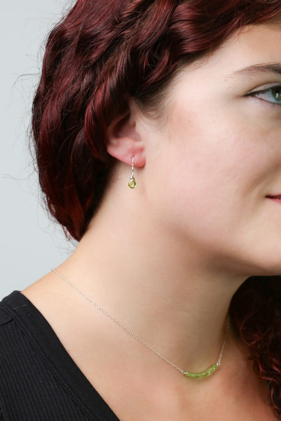 A beautiful gift for those born in August, featuring their birthstone of stunning peridot that is hand wrapped in sterling silver wire. These feminine briolette earrings dangle from sterling silver ear wires.