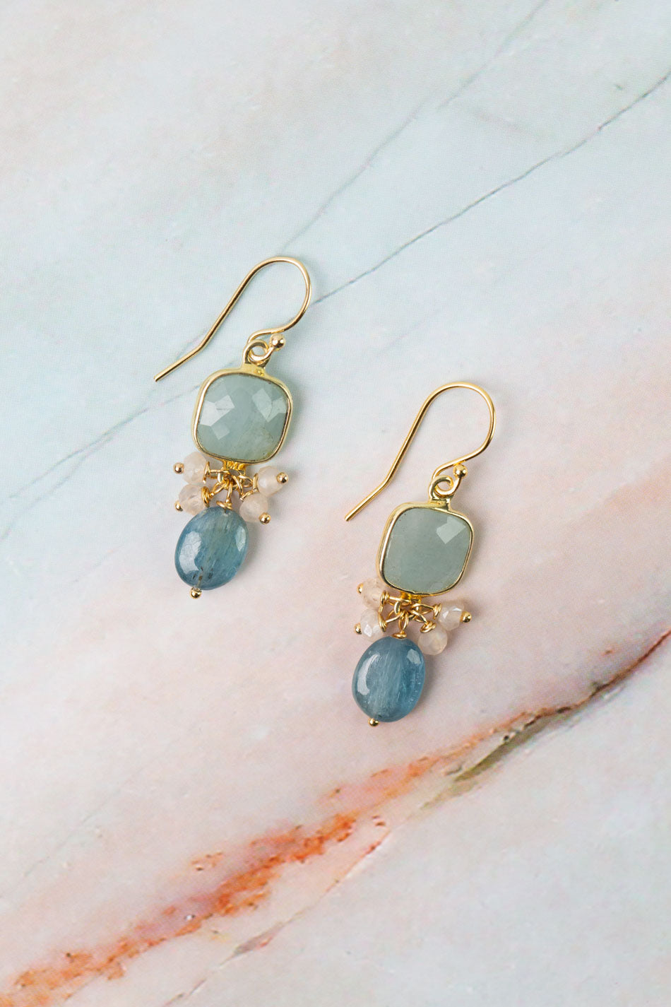 Ocean Waves Kyanite, Aquamarine Bezel, Taupe Chalcedony Dangle Earrings