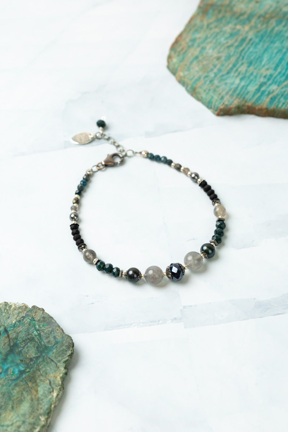 Eclipse 7.5-8.5" Grandiderite, Freshwater Pearl, Labradorite With Moonstone Simple Bracelet