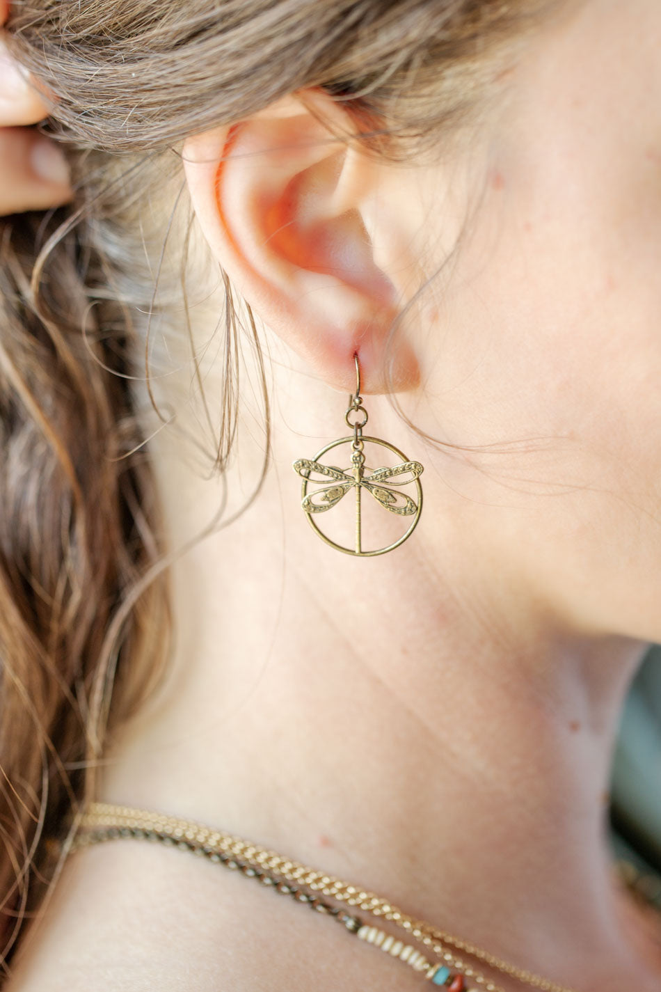 Enlighten Antique Brass Filigree Dragonfly Simple Earrings