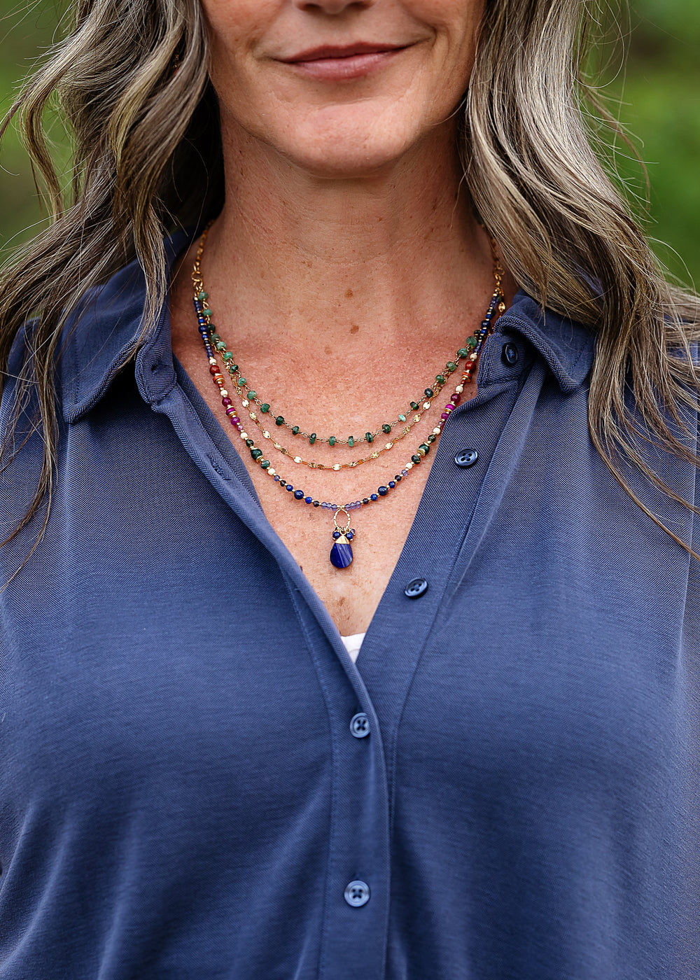 Forget Me Not 19.5-21.5" Emerald, Fuchsia Jade, Red Jasper With Twisted Lapis Lazuli Pendant Multistrand Necklace