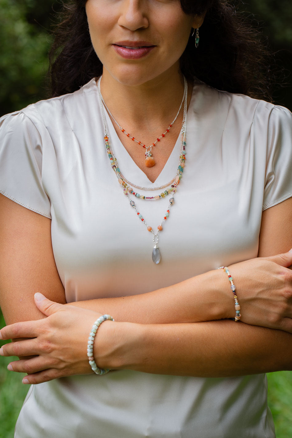 Gentle Breeze features a delicate palette of pastel stones, earthy tones, and subtle shimmer. Each piece is handcrafted with a thoughtful blend of gemstones, creating a harmonious dance of color and texture.