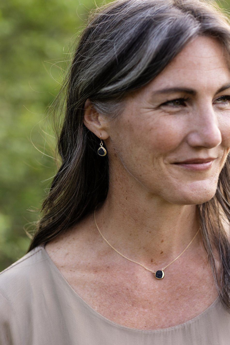 Elegance and contrast are on display in this AVD favorite, created with black druzy. The bezel is set in gold with gold filled ear wires hanging at approximately 1" in length. Don't miss the matching necklace!