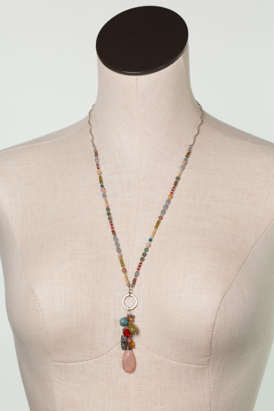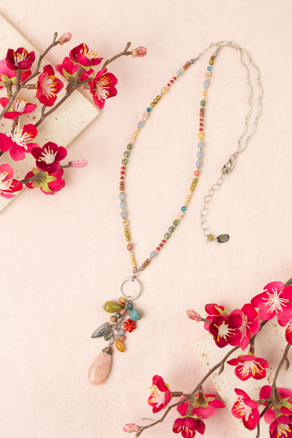 Leilani 23.5-25.5" Peach Moonstone, Olive Jade, Spiny Oyster Tassel Necklace