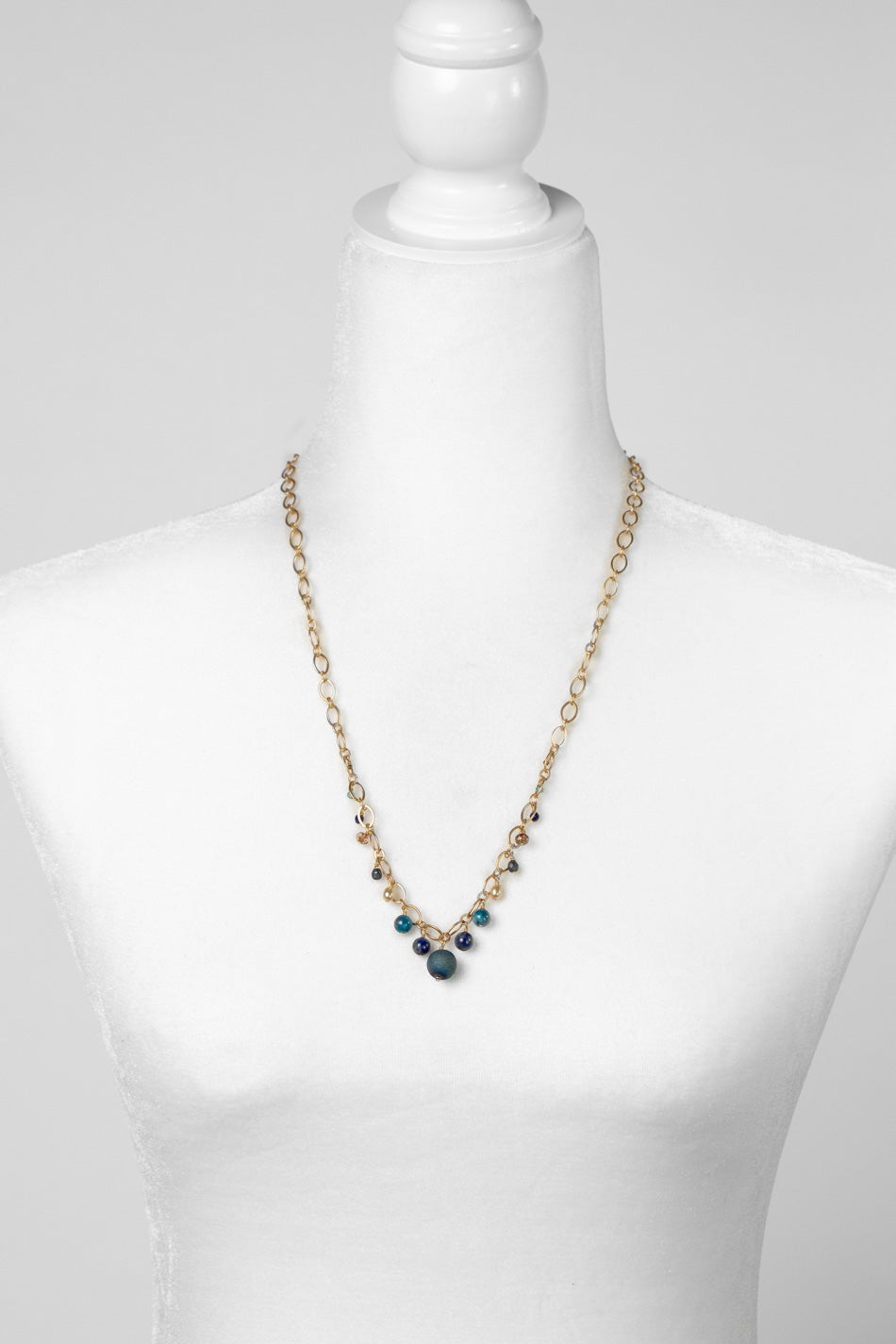 Starry Night 27.5" Lapis Lazuli, Blue Apatite, Fresh Water Pearl with Titanium Plated Round Geode Bead Cluster Necklace