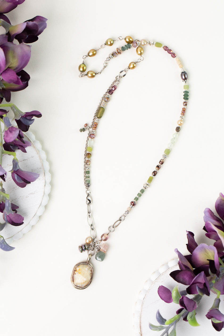 Water Lily 20" Roman Glass, Prehnite, Freshwater Pearl with Yellow Opal Bezel Collage Necklace