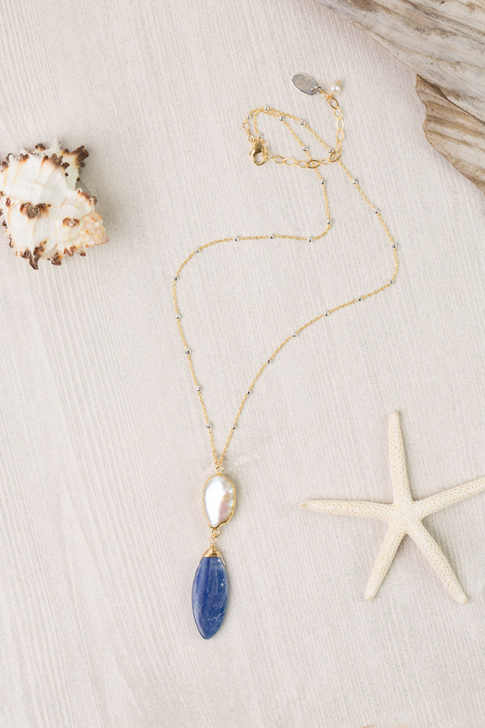 Seaside 16-18" Freshwater Pearl, Kyanite Drop Focal Necklace