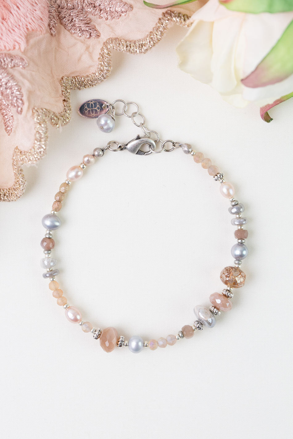 Blush 7.5-8.5" Crystal, Peach Moonstone, Freshwater Pearl Simple Bracelets
