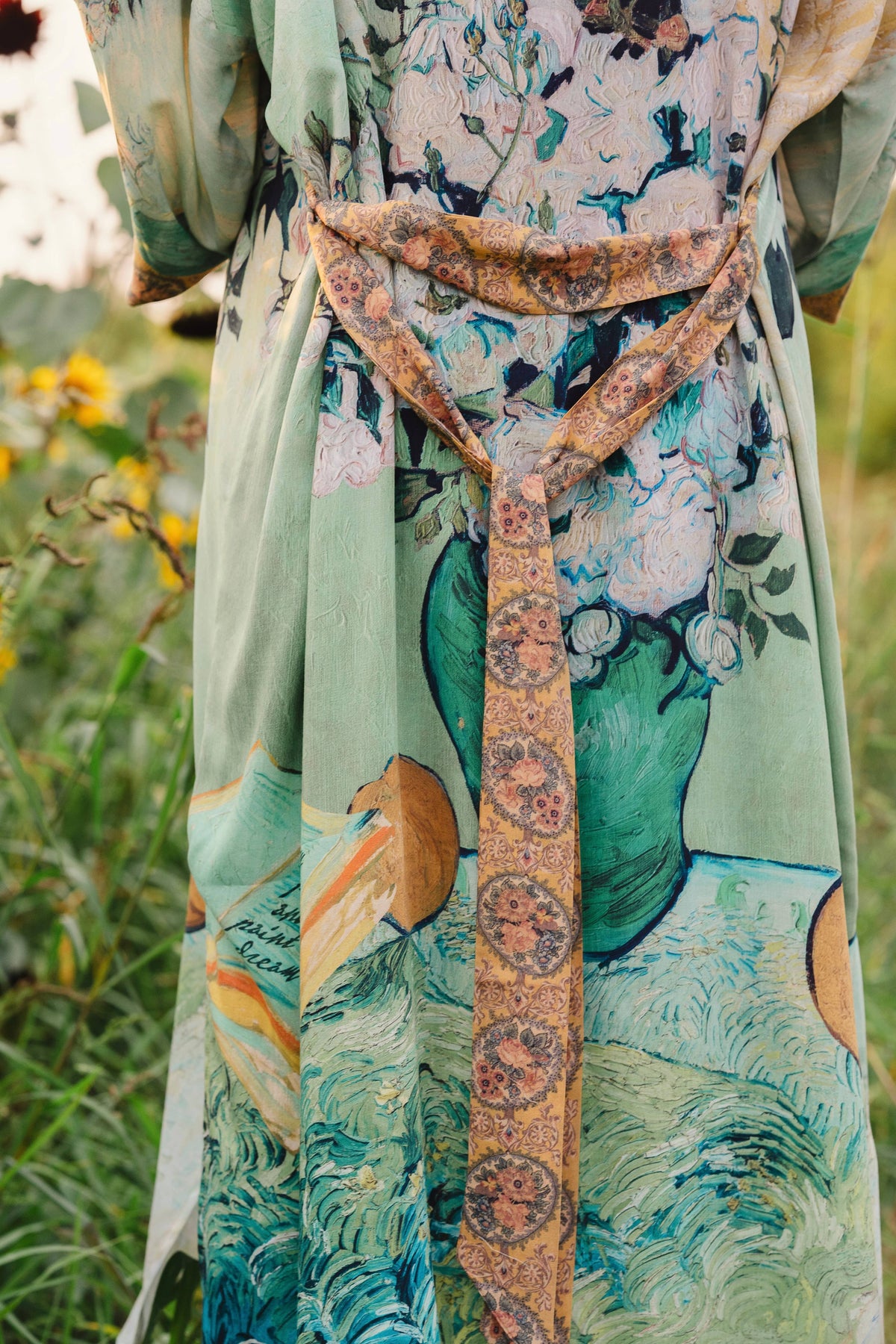We combined several of Van Gogh’s works to create this print — including his infamous “Roses” (1890), painted during his time at the Saint-Paul-de-Mausole asylum, which captures the delicate beauty of blooming flowers as a symbol of hope. The words “I dream my painting and I paint my dream”, written in the book on the table, is our very favourite quote from the artist himself. As a significant, final touch, we added the eye from Van Gogh’s “Self Portrait with a Straw Hat” (1887), a painting which offers an intimate glimpse into the artist’s soul. 100% viscose (derived from plant fibres such as wood and bamboo). Machine wash gentle or handwash and hang to dry. Kimono measurements: length 92cm , width 110cm. boho bohemian artistic impressionist vintage-inspired fashion everyday lounge chic summer sun spring style
