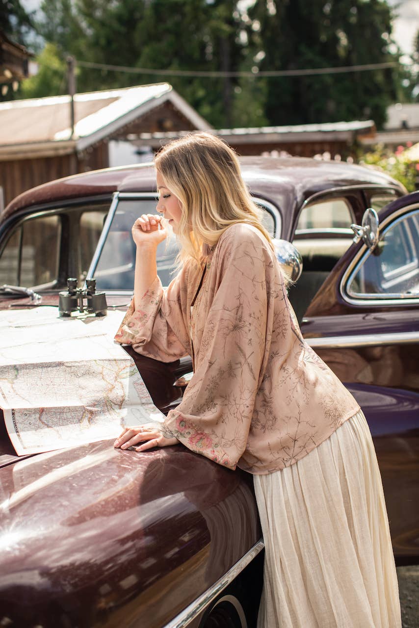 Created using an original 1846 print from New York entitled “A Map of the Open Country of a Woman’s Heart”, it depicted exactly that — a fanciful imagining of a woman’s heart, drawn as a map. We completely adored the concept — but definitely didn’t adore some of the language! So we got to work, swapping out many of the country titles like “Land of Fickleness” and “Land of Vanity” (no thank you), to what we feel in our own hearts — like “Land of Strength” and “Region of Reckless Joy”. Some of the original wording we decided to keep — including “District of Love” and “Land of Love of Dress”— because hey, fashion will always be in our hearts ;) 100% viscose (derived from plant fibres such as wood and bamboo). Machine wash delicate or handwash, hang to dry. Kimono meaurements: length 60cm, width (across back, underarm to underarm) 74cm. Model is 5'3" for reference. * boho gypsy chic lounge bohemian vintage beach poolside artisan