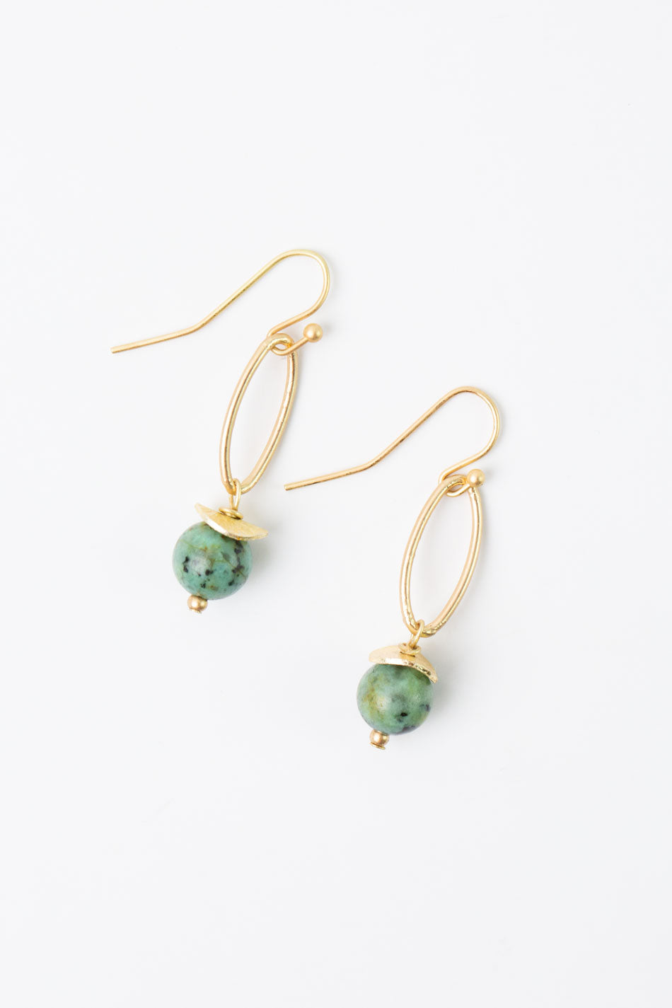 A simple African turquoise focal dangled from a matte gold plated brass oval earring for women.
