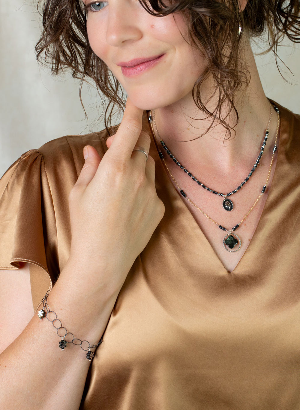 Nightfall 21-23" Black Hematite Rondelle With Black Lip Shell Clover Collage Necklace