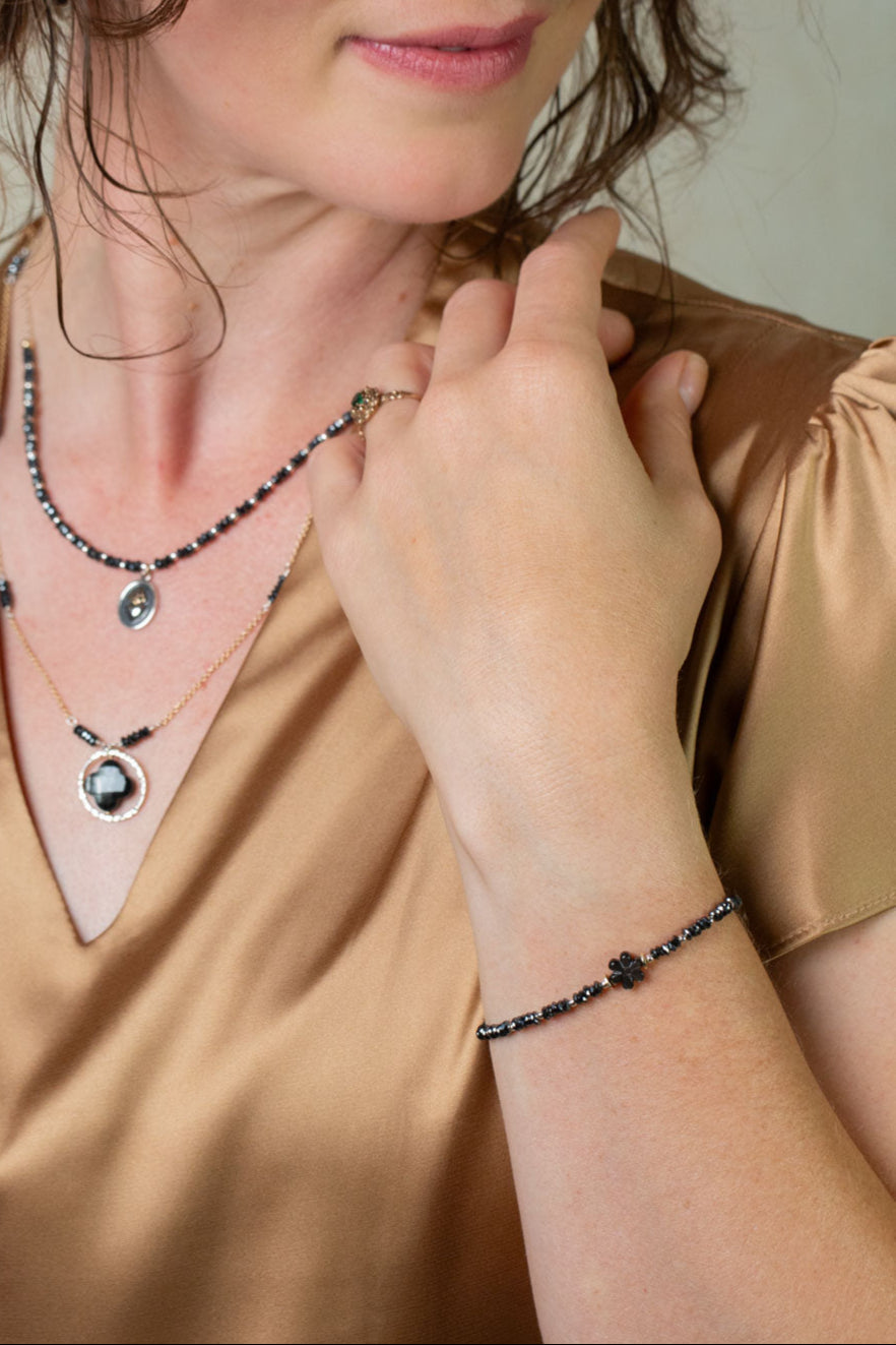 Nightfall 7.5-8.5" Black Hematite Rondelle, Abalone Flower Simple Bracelet
