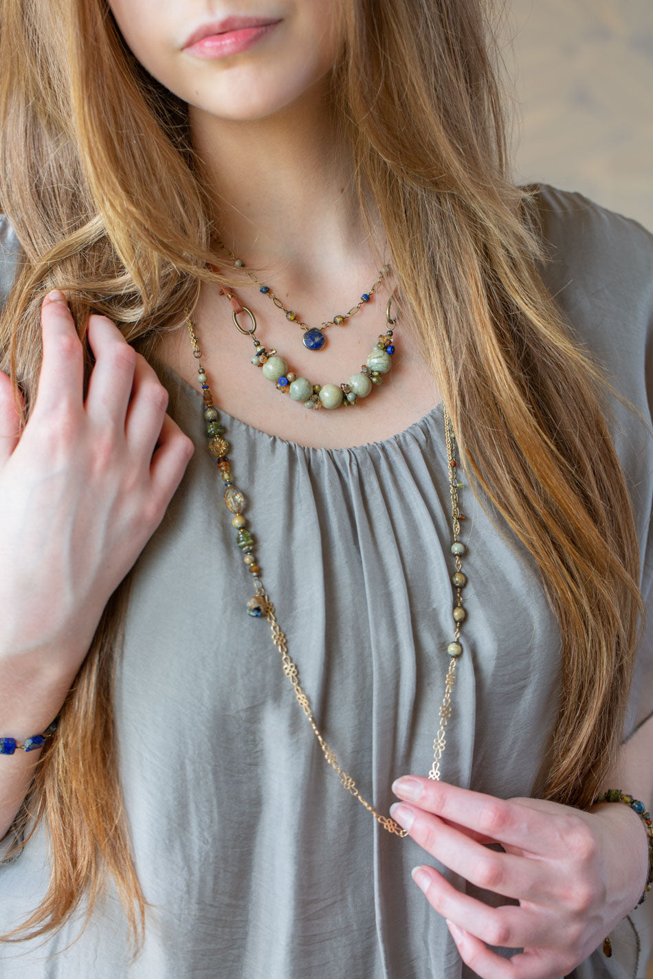 The Sacred Heart Collection blends vintage textures with soulful color. Earthy gemstones with hand-strung beads create a look that’s both meaningful and beautifully wearable.