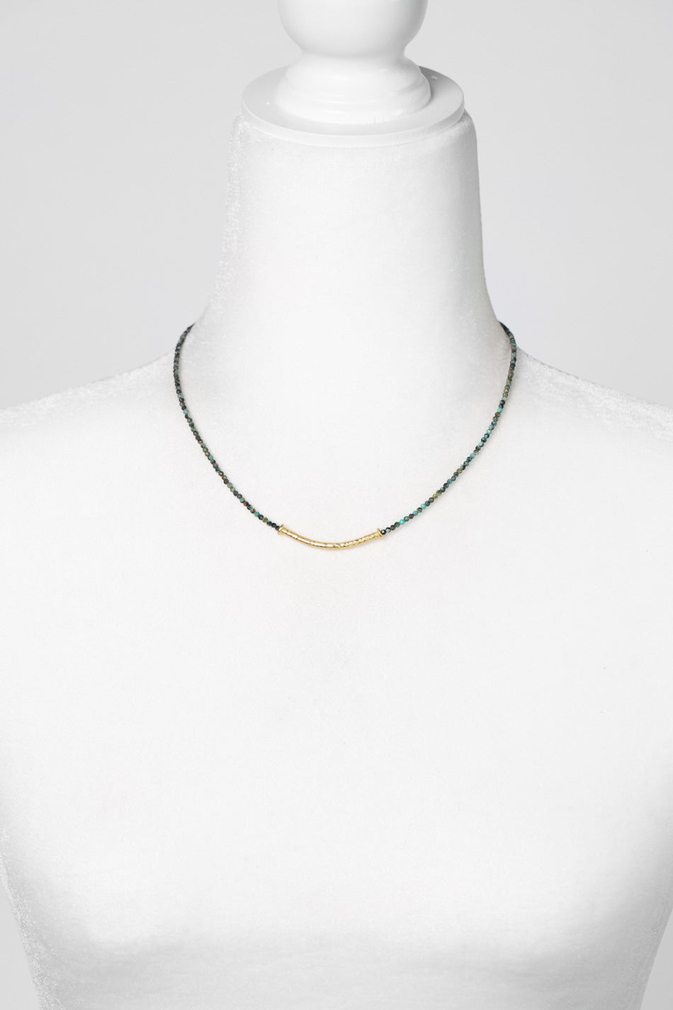 A strand of African Turquoise accented by an ornate matte gold plated brass bar focal.