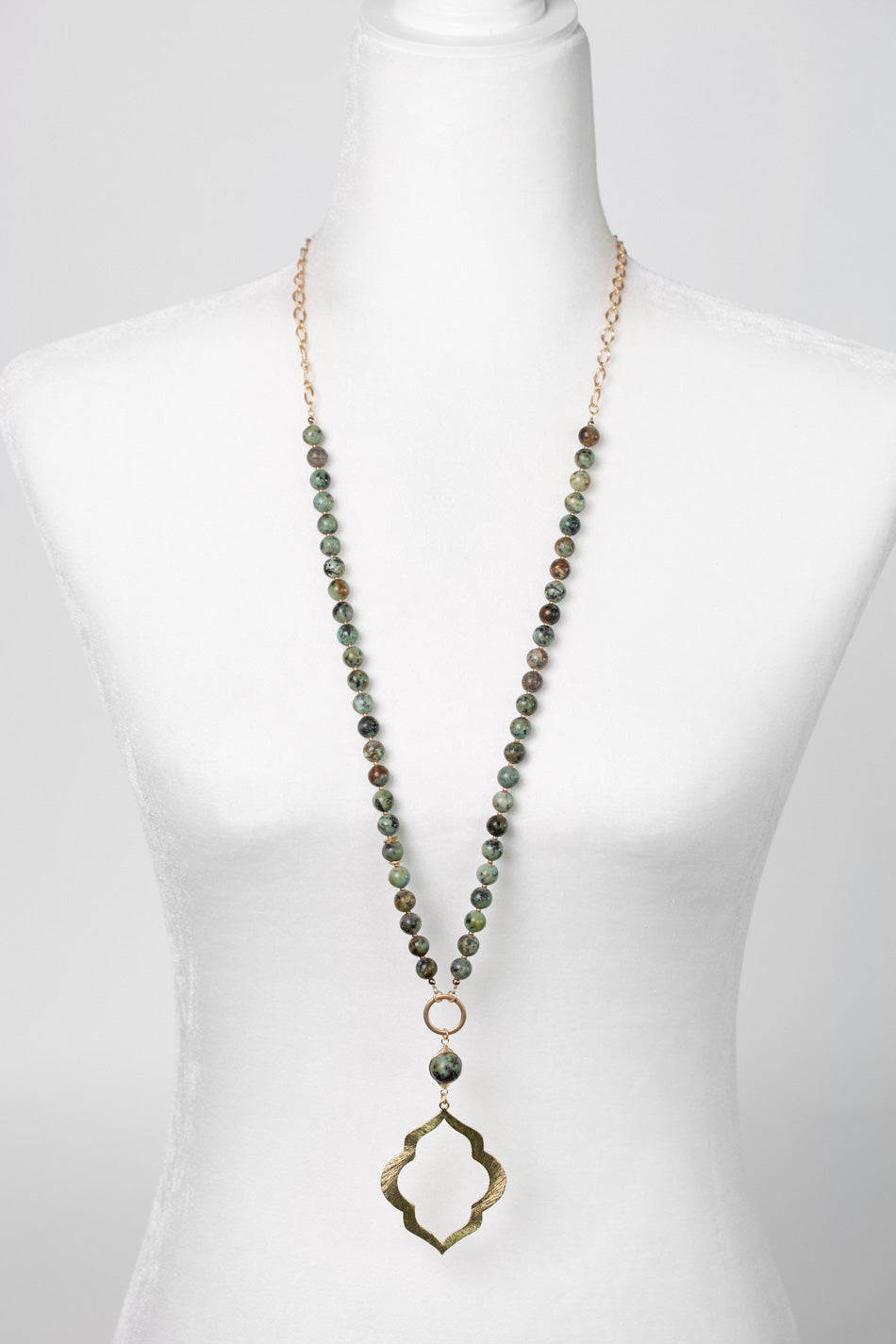African Turquoise with matte gold seed bead spacers frames a focal consisting of African Turquoise wrapped in a herringbone weave with gold filled wire and a matte gold plated brass fancy diamond drop pendant.