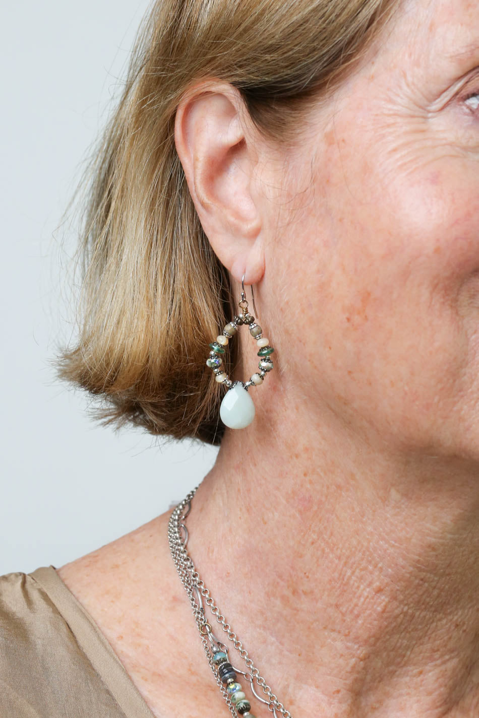 Venetian Dreams Czech Glass, Mother Of Pearl With Faceted Amazonite Briolette Hoop Earrings