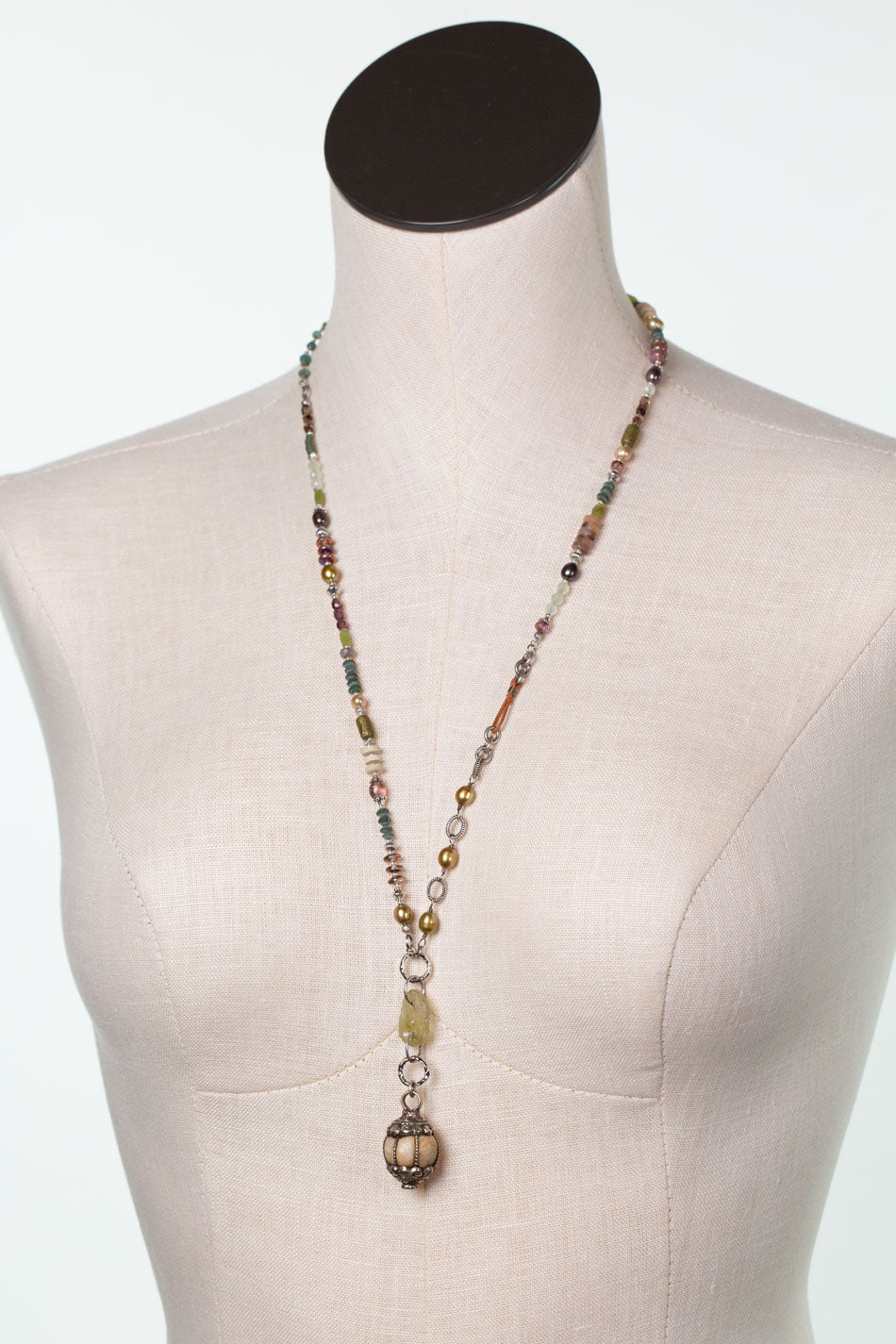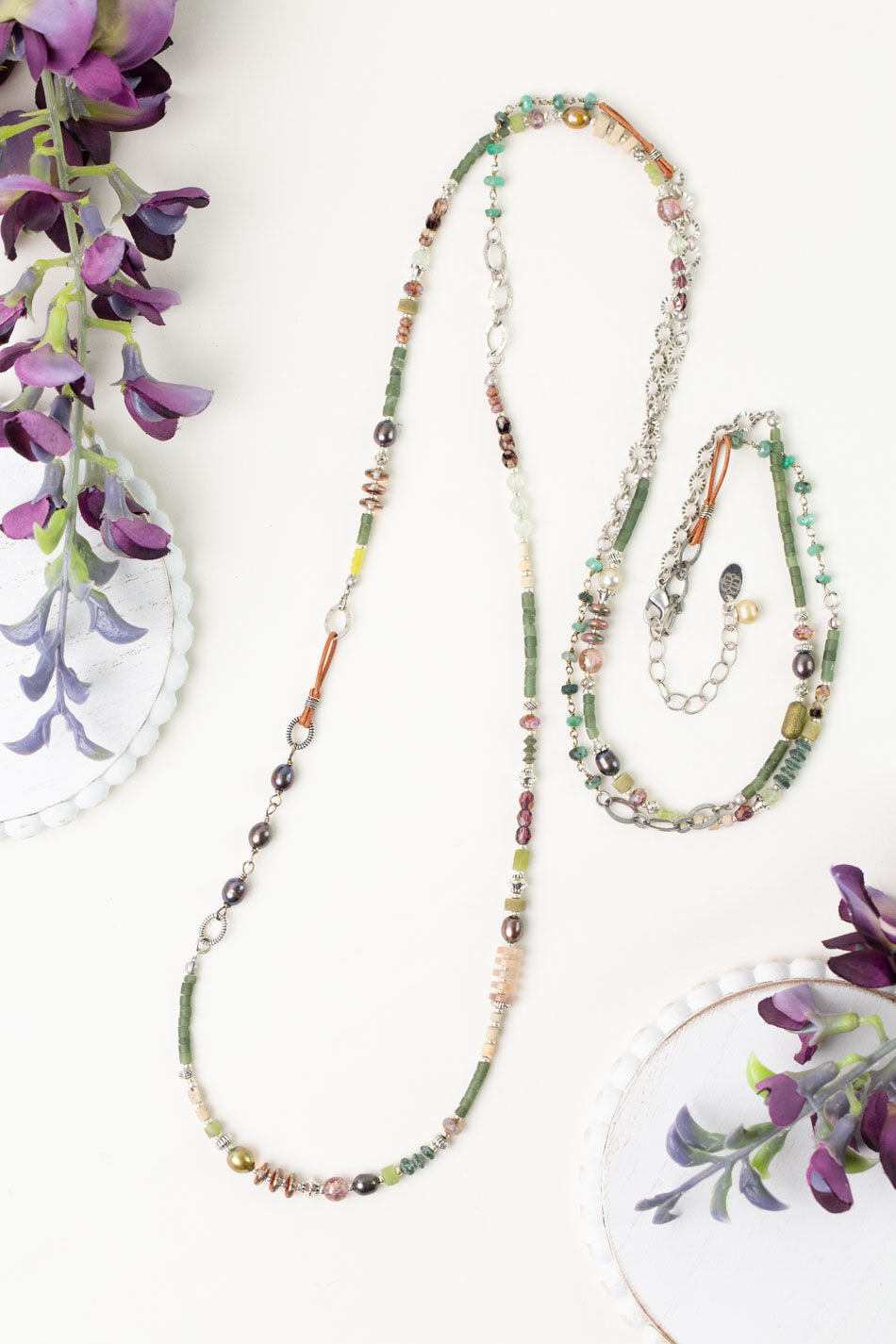 Water Lily 55-57" Czech Glass, Freshwater Pearl, Prehnite Collage Necklace