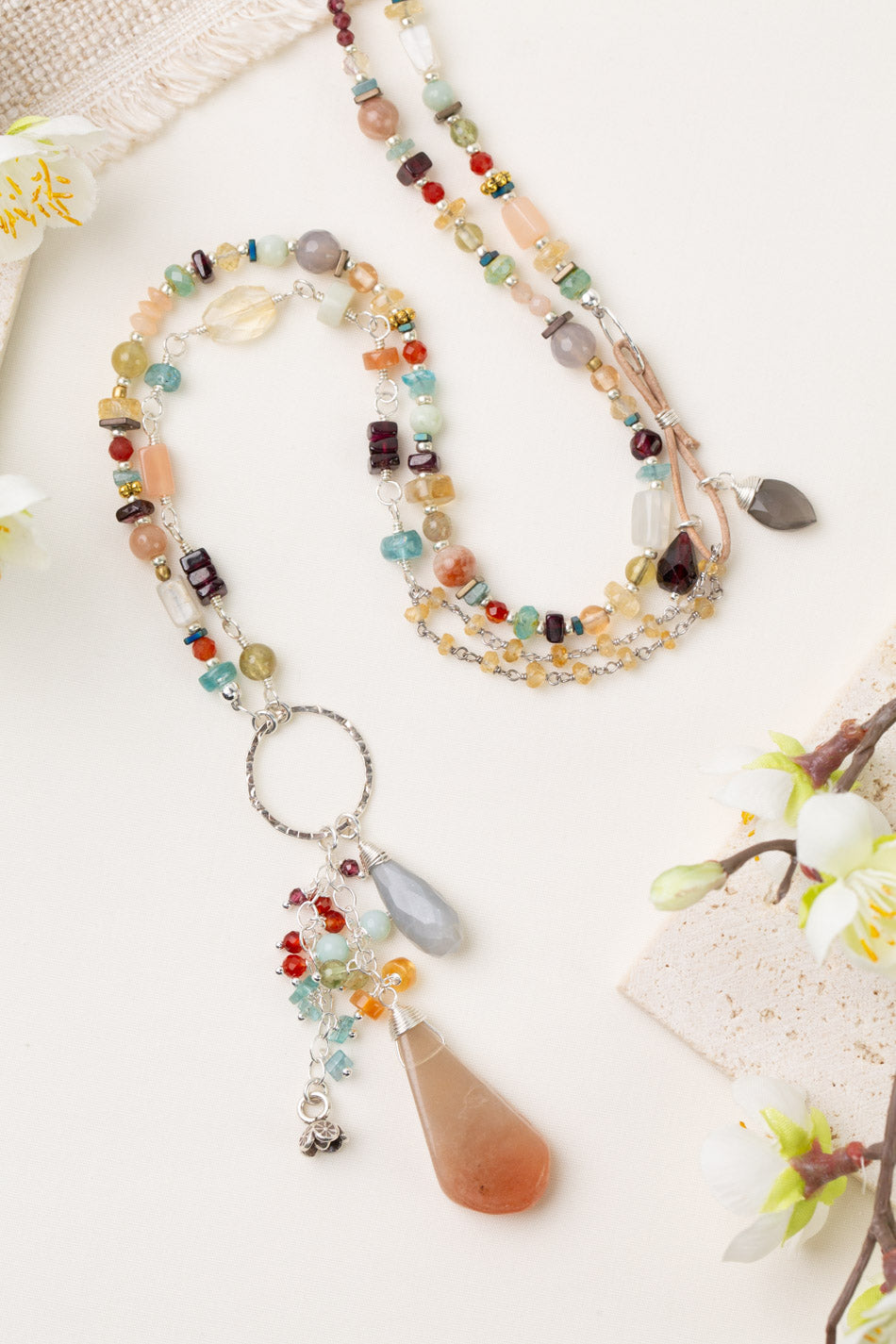 Gentle Breeze 31-33" Peach Moonstone, Carnelian, Apatite Collage Necklace