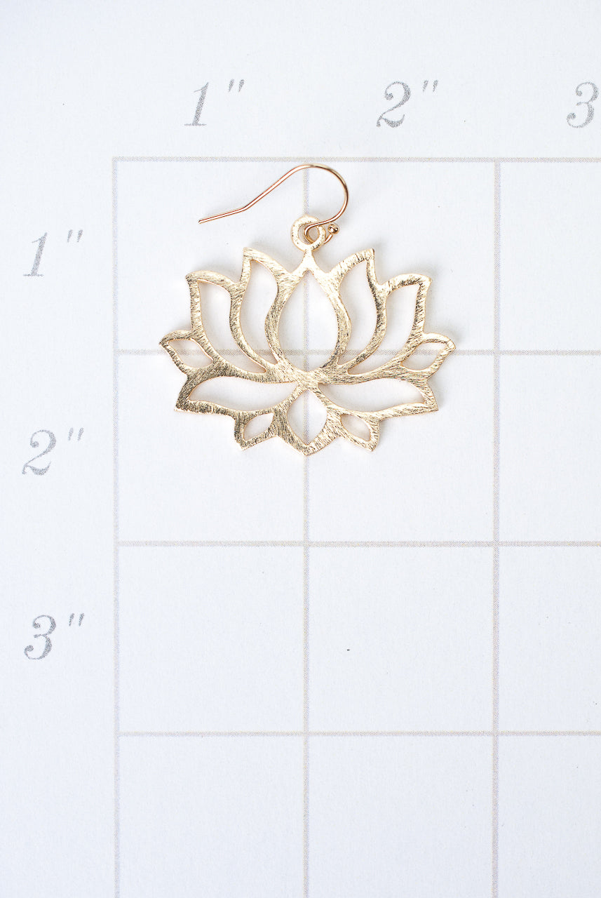 These fun lotus flower dangle style earrings are great for any wardrobe. Handcrafted with brushed gold for an easy styled look.