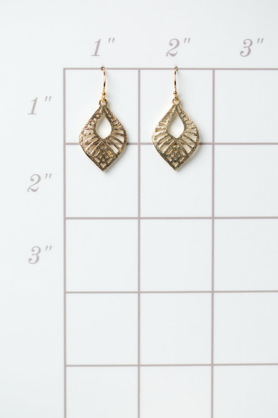 These unique brushed gold earrings reflect the light with a radial design and diamond pattern at the base. They are created with brushed gold plated brass, and dangle from gold filled earwires.
