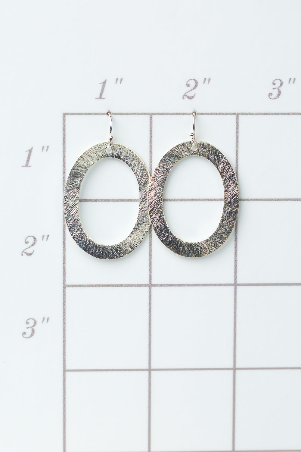 The brushed silver findings in a simple hoop frame design. They are created with brushed silver plated brass, and dangle at approximately 1.75" from sterling silver ear wires.
