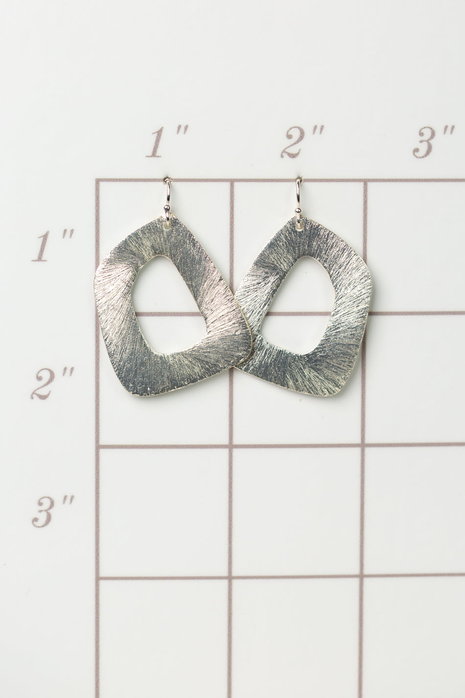 The brushed silver findings in a fun and unique design. They are created with brushed silver plated brass, and dangle at approximately 1.5" from sterling silver ear wires.