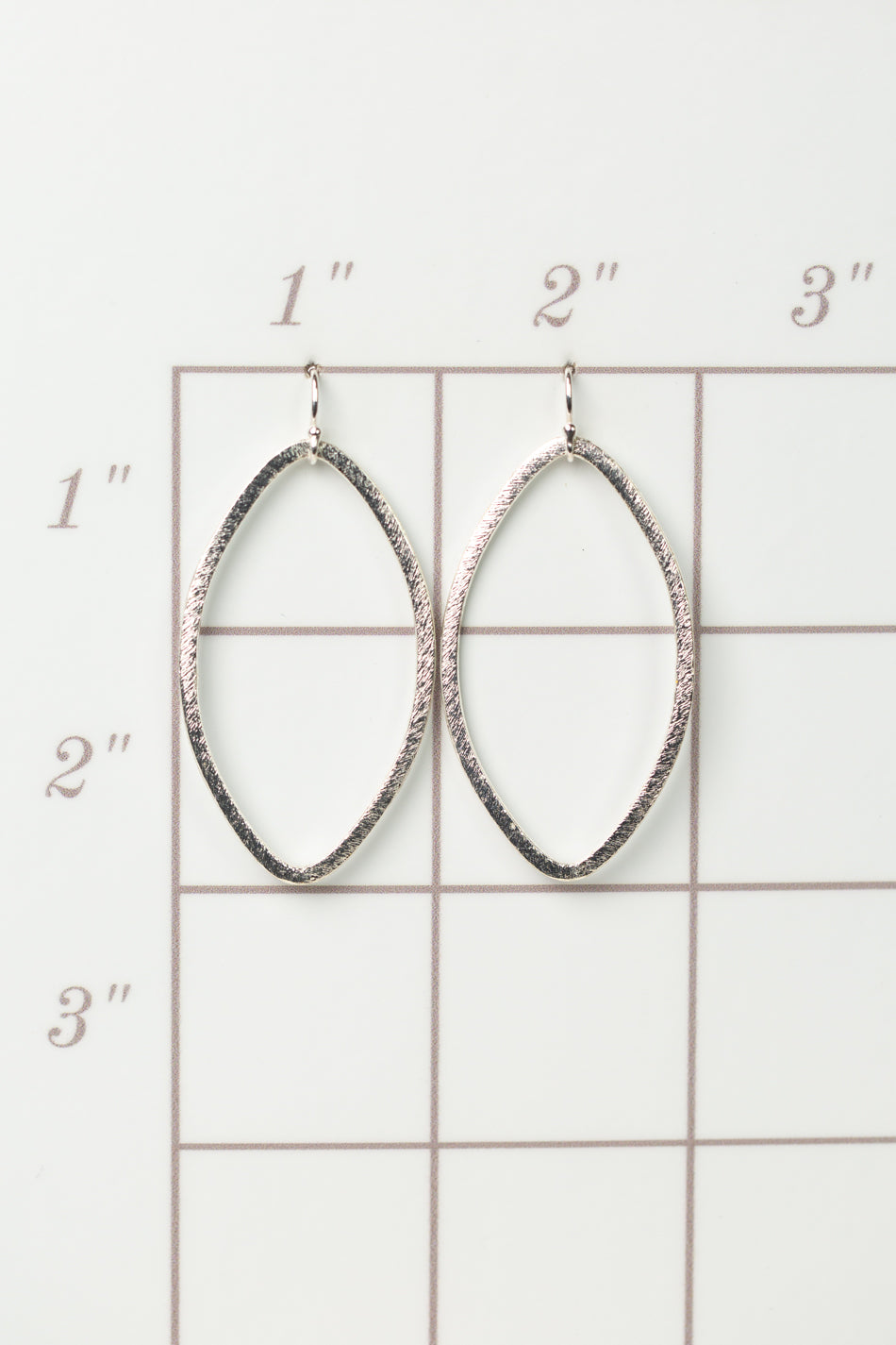 The brushed silver findings in a simple yet elegant oval frame design. They are created with brushed silver plated brass, and dangle at approximately 2" from sterling silver ear wires.