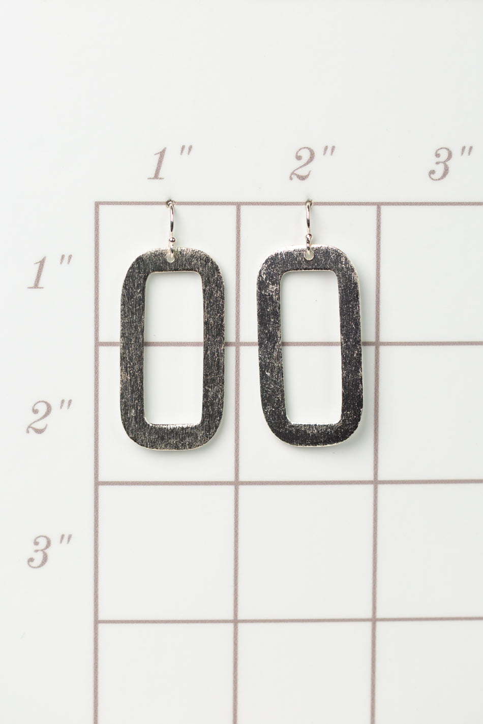 The brushed silver findings are mid length and come in a simple framed design. They are created with brushed silver plated brass, and dangle at approximately 1.75" from sterling silver ear wires.