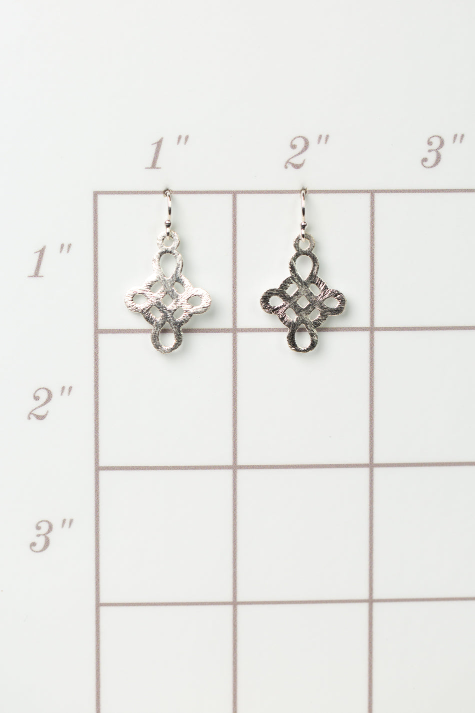 The brushed silver findings in a detailed cross design. They are created with brushed silver plated brass, and dangle at approximately 1" from sterling silver ear wires.