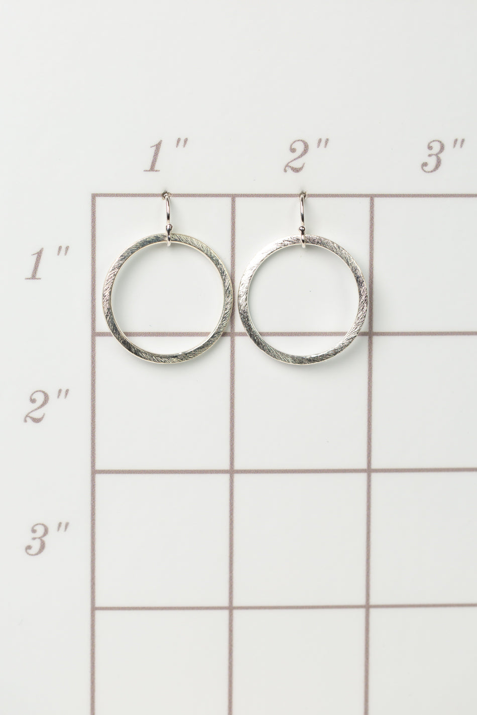 The brushed silver findings in a simple and classic hoop design. They are created with brushed silver plated brass, and dangle at approximately 1" from sterling silver ear wires.