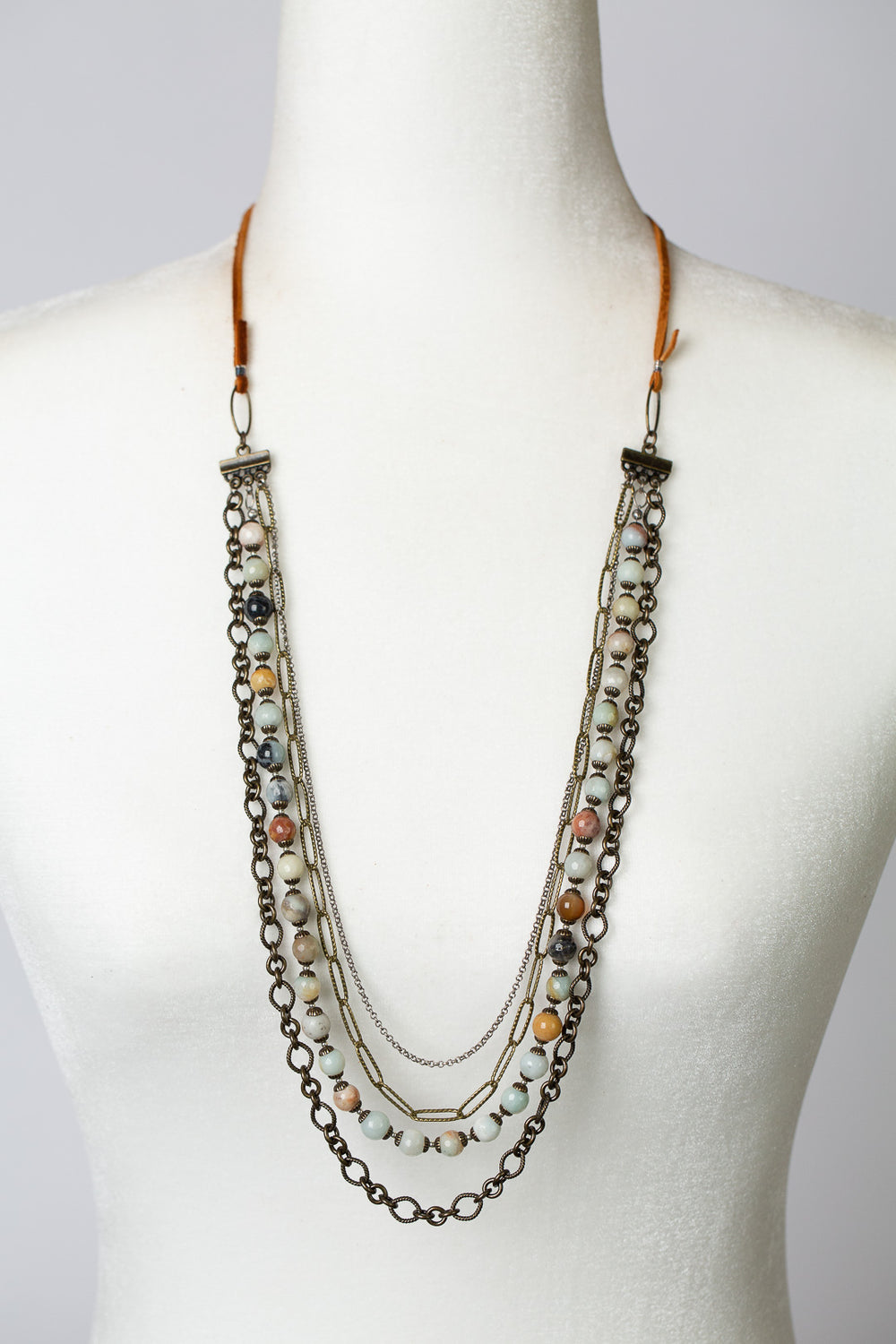 A handcrafted multistrand design featuring antique brass and amazonite, anchored with leather to provided adjustable length.