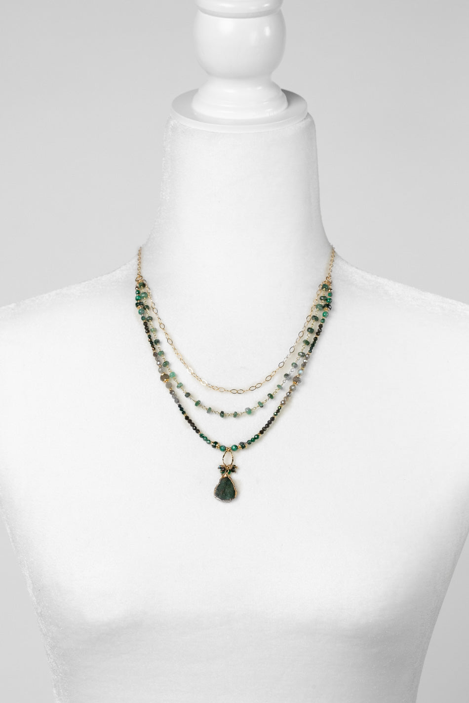 Verdant 16.5-18.5" Malachite, Labradorite, Cats Eye With Emerald Slab Cut Pendant Multistrand Necklace
